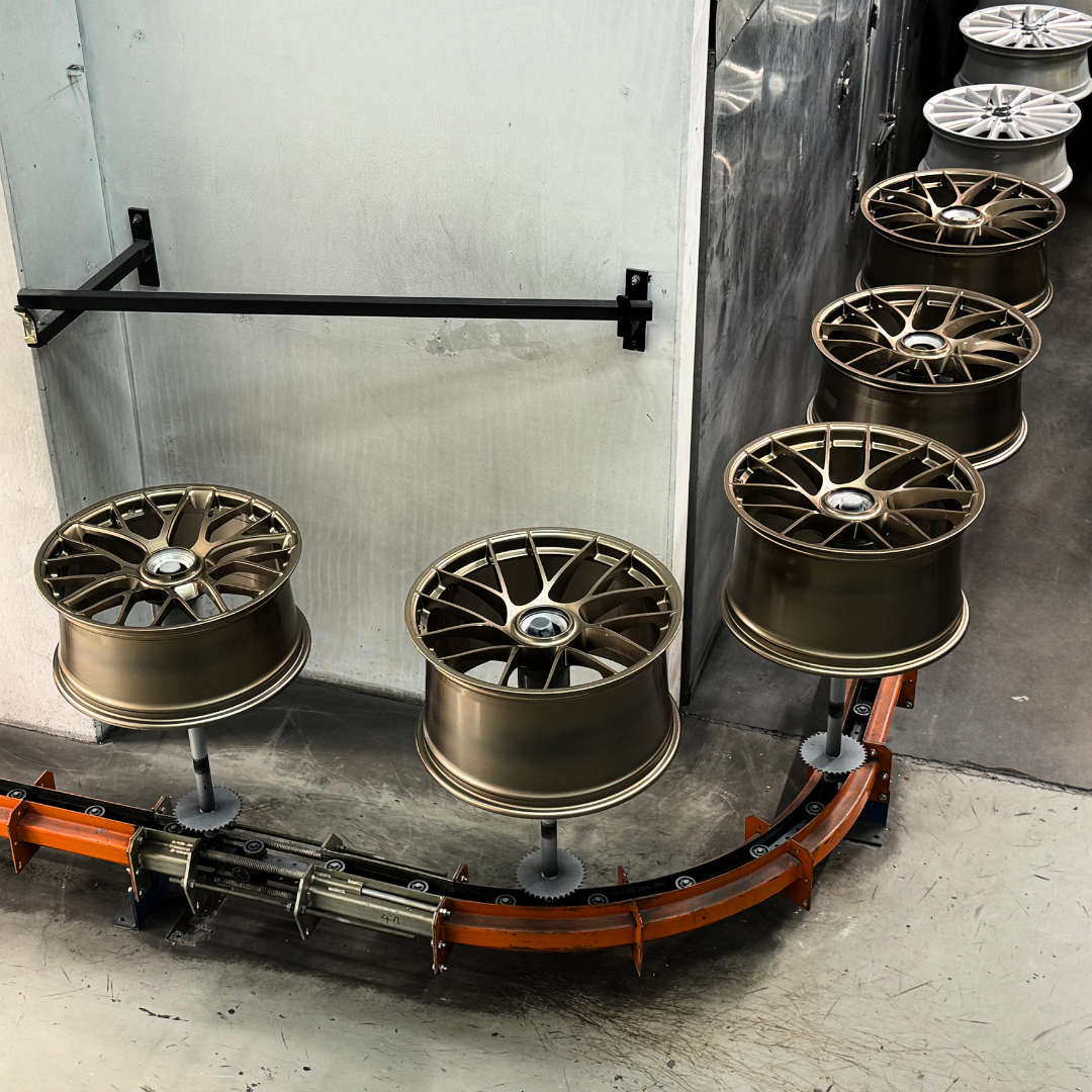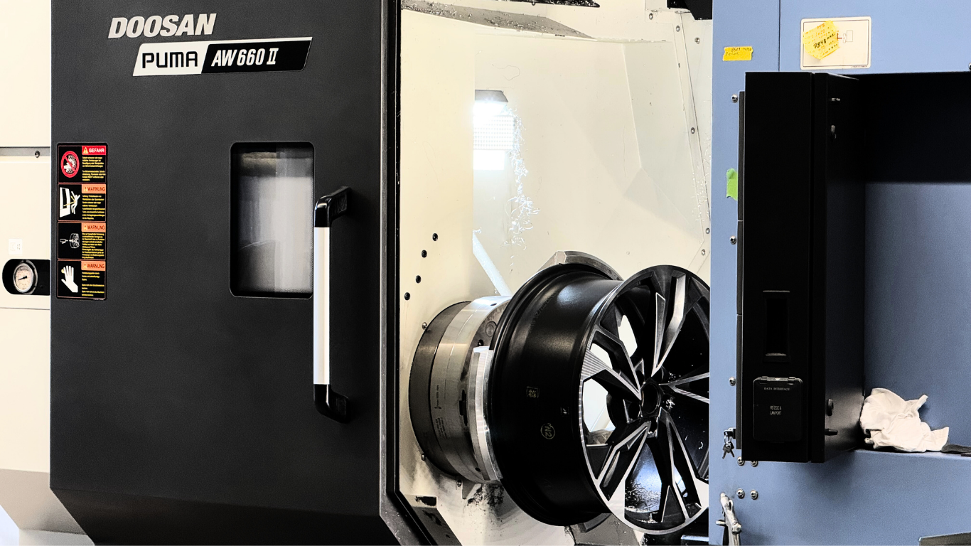 - Glanzgedrehte Felgen werden präzise per CNC-Maschine bearbeitet.